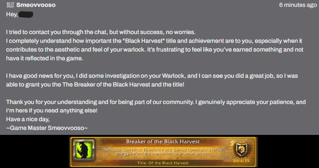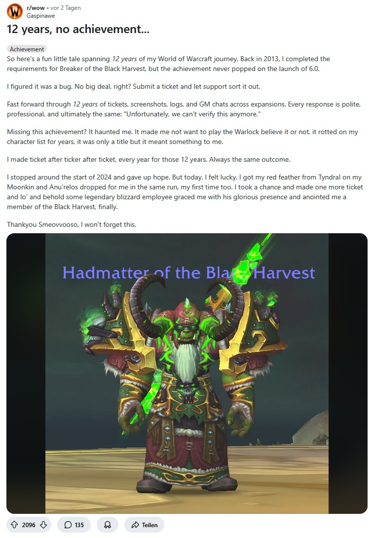 Er dachte, es wäre ein Fehler und hat sich nicht weiter darum gekümmert, bis er später ein Ticket an Blizzard geschickt hat. Seitdem hat ihm der Support jedes Mal geantwortet, dass sie den Fehler nicht beheben können und dass es nicht mehr möglich ist, diesen Erfolg auf seinem Konto zu implementieren.