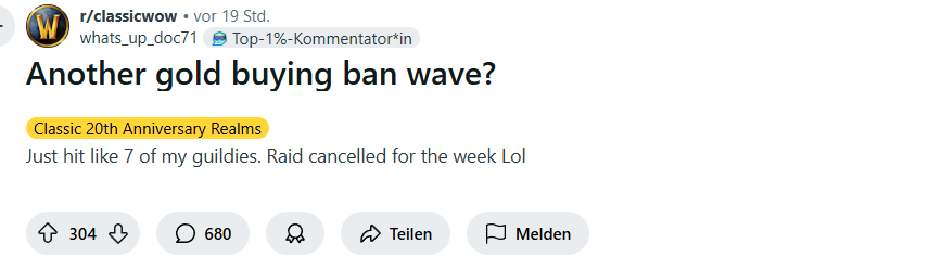 Auf Reddit und anderen Plattformen häufen sich in den letzten Tagen Berichte über Accounts, die gesperrt wurden – offenbar, weil Gold von Drittanbietern gekauft wurde. Ein besonders aufsehenerregender Kommentar kommt aus einer betroffenen Gilde: