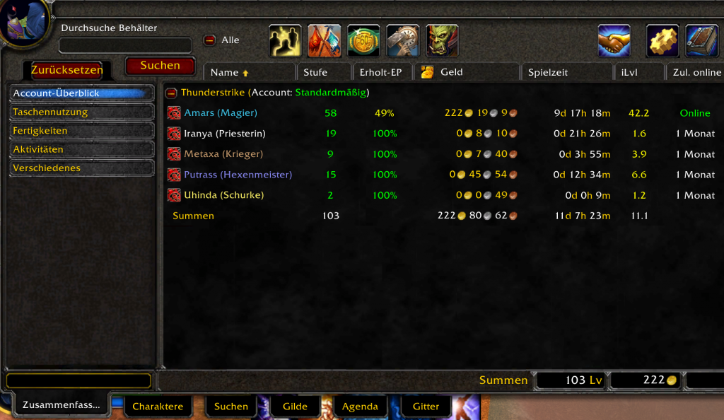 Altoholic ist für alle gedacht, die mehrere Figuren spielen und nicht jedes Mal umloggen möchten, nur um nachzusehen, wo etwas liegt. Es sammelt Informationen zu deinen Nebenfiguren und zeigt dir vieles gebündelt: zum Beispiel, was in Taschen und Postfächern liegt, und auch weitere Übersichten rund ums Konto. Der Kern ist: mehr Wissen über alle Figuren, ohne dauernd neu einloggen zu müssen.