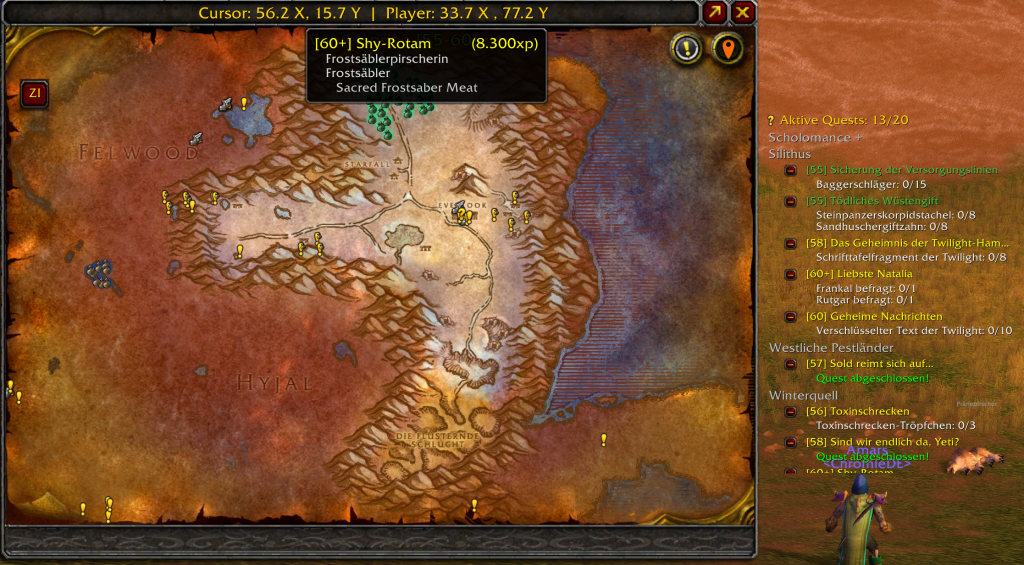 Dazu kommen Komfortfunktionen: Mit der linken Maustaste kannst du Aufgaben in der Verfolgung direkt öffnen, und mit weiteren Optionen kannst du zum Beispiel eine Aufgabe hervorheben, sodass andere Symbole unauffälliger werden. Es gibt Hinweise in Kurzinfos (zum Beispiel auf Kartensymbolen oder bei Aufgaben-Personen/Gegenständen), und mit einer Zusatzerweiterung kann sogar ein Richtungspfeil auf Ziele zeigen. Questie kann außerdem den Weg deiner Reise protokollieren, Aufgaben eines Gebiets getrennt nach verfügbar und erledigt auflisten und die Datenbank durchsuchen. Alles ist sehr umfangreich einstellbar.