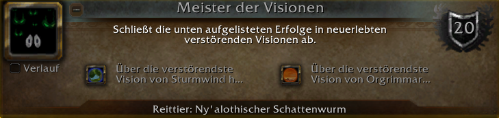 Der Erfolg verlangt von euch, dass ihr die Erfolge “Über die verstörendste Vision von Sturmwind hinaus” und “Über die verstörendste Vision von Orgrimmar hinaus” erspielt.