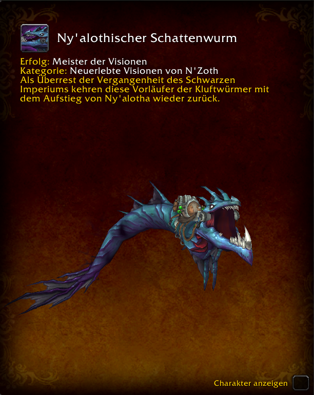 Solltet ihr es geschafft haben und euch den Erfolg erspielt haben, erwartet euch das Reittier “Ny’alotischer Schattenwurm” als Belohnung.