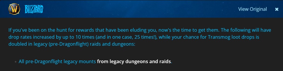 Übersetzung: Wenn ihr auf der Jagd nach Belohnungen seid, die euch bislang entgangen sind, habt ihr jetzt die Chance, sie euch zu sichern. Die Häufigkeit der folgenden Belohnungen wurde auf das bis zu 10-Fache (bzw. in einem Fall sogar auf das 25-Fache!) erhöht und eure Chance auf Transmogrifikationen ist in klassischen (vor Dragonflight) Schlachtzügen und Dungeons verdoppelt:
