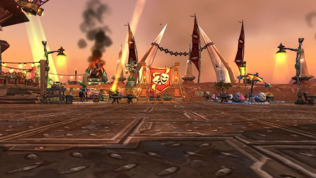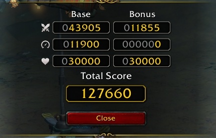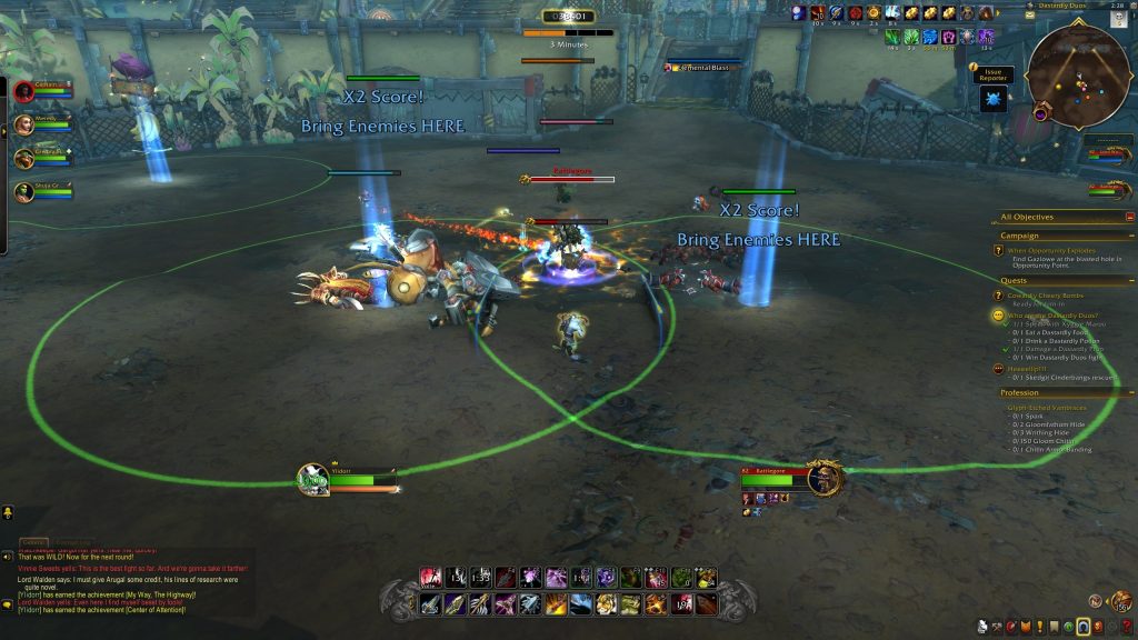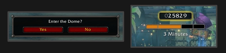 Oben in der Benutzeroberfläche wird die Gesamtpunktzahl der Gruppe zusammen mit der verbleibenden Zeit angezeigt, die zur Bonuspunktezahl beiträgt, sobald alle Gegner in der Arena besiegt wurden. Die Instanz beginnt mit typischen Dungeon- und Elite-Mobs und endet mit zwei animatronischen Bossen.