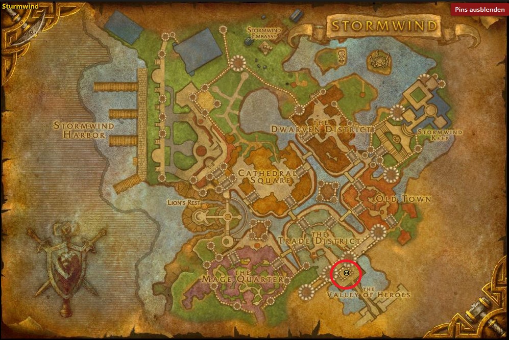 Der Treffpunkt für die „Durchtriebene Duos“ in Sturmwind ist direkt über dem Haupteingang der Stadt bei /way 67.7, 80.0.