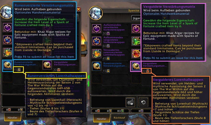 Hergestellte Ausrüstungsteile aus Berufen sind ein wichtiger Teil der Ausrüstung im Endgame und wurden im Rahmen des Events ein bisschen verbessert. Mit Funken des Glücks hergestellte Rezepte können mit einer Verstärkungsmatrix weiterverarbeitet werden, wodurch der Gegenstand auf bis zu 6 Gegenstandsstufen verbessert werden kann! Diese kannst du bei Llande oder Syenite in Dornogol kaufen.