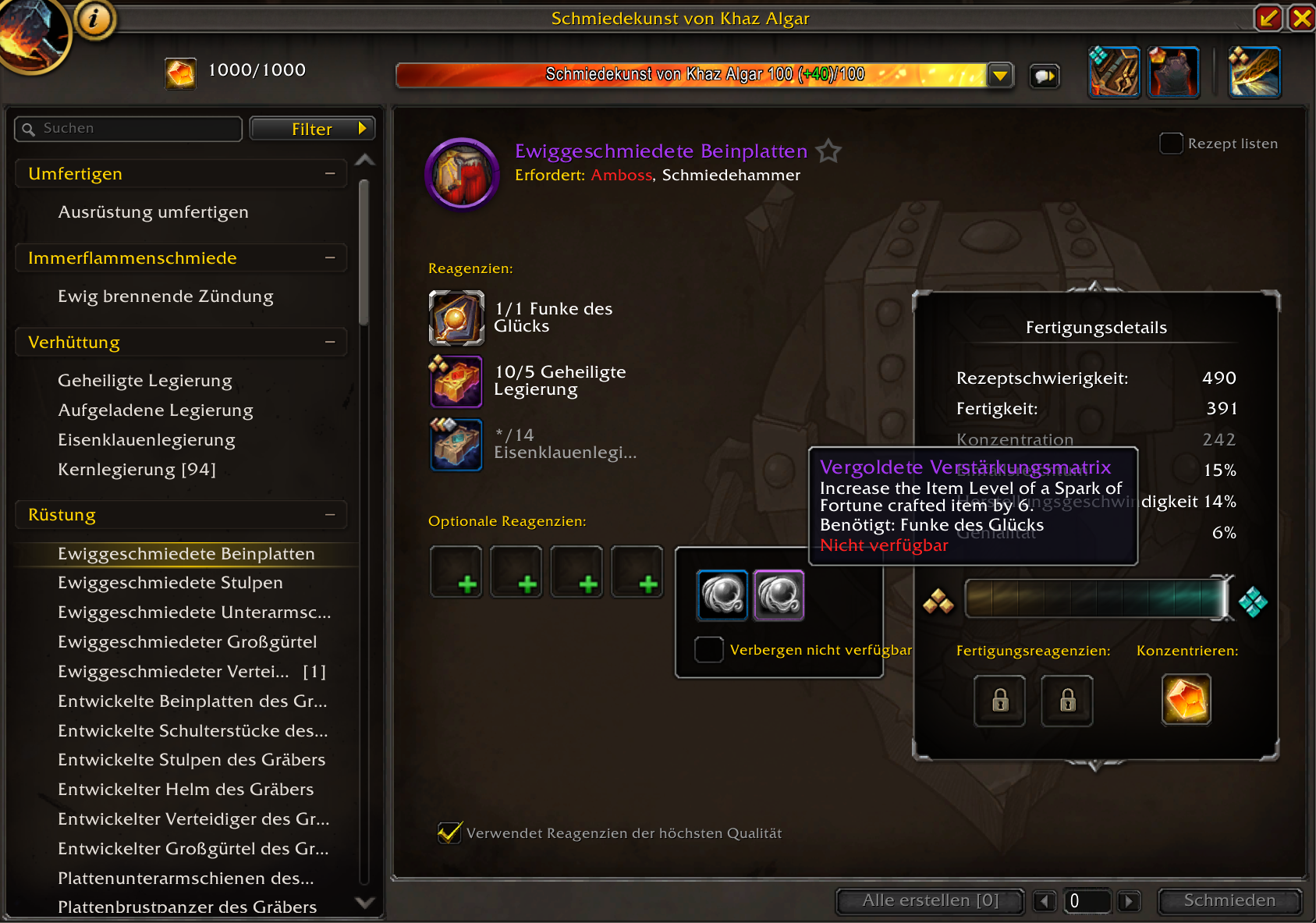 Das Bild unten zeigt ein Beispiel für einen Herstellungsauftrag mit der neuen Verstärkungsmatrix. Es gibt einen neuen optionalen Reagenzienplatz, an dem du deine Verstärkungsmatrix verwenden kannst, aber um die Bonusgegenstandsstufen zu erhalten, musst du den Gegenstand neu herstellen.
