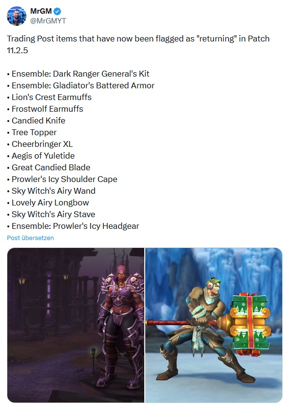 Laut einem Beitrag von MrGM auf X wurden folgende Gegenstände des Handelspostens für Patch 11.2.5 als “wiederkehrend” markiert.