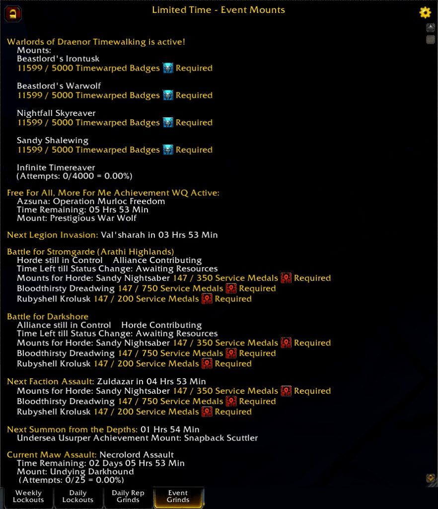 - Enthält Timer für wichtige Events wie den Dunkelmondjahrmarkt, Zeitwanderungs-Events, Invasionen der Legion, Kriegsfronten, BFA-Fraktionsangriffe, Shadowland Schlund-Events und mehr.