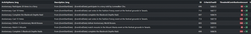 Besonders spannend: Der temporale Schwarzfelstiefen-Schlachtzug (Blackrock Depths Raid), der erstmals im Rahmen eines früheren Jubiläums-Events spielbar war, taucht wieder in den Daten auf. Auch wenn Blizzard diesen Raid nicht mit der klassischen Zeitwanderung verknüpft hatte, sieht es ganz danach aus, als würde er bald wieder spielbar sein – sehr zur Freude vieler Fans!