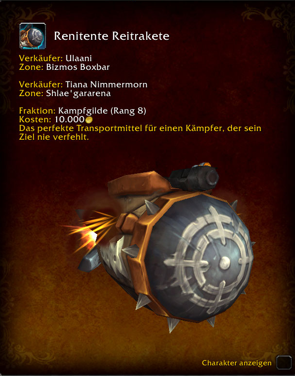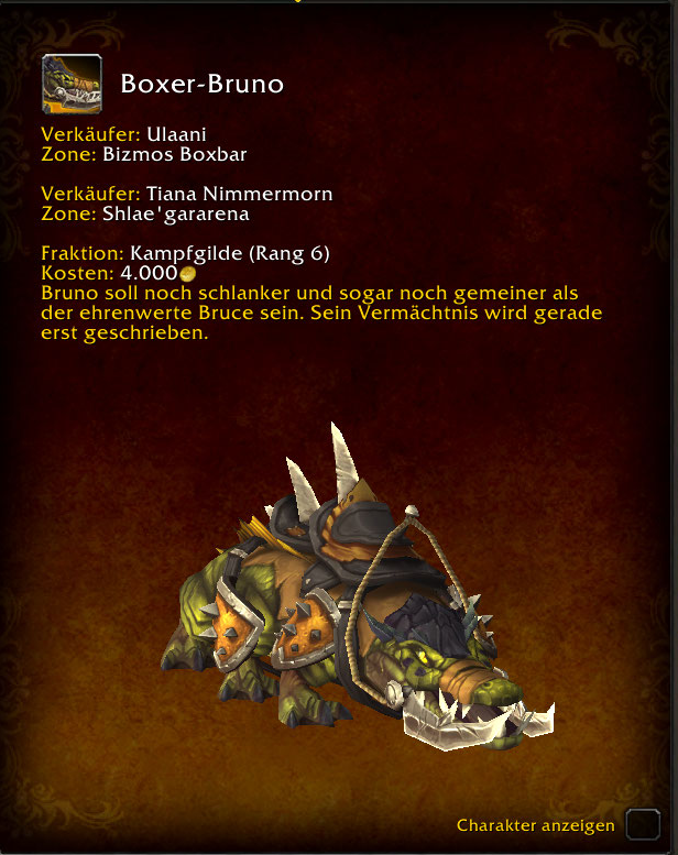 - Ort Allianz: Bizmos Boxbar unter der Tiefenbahn zwischen Sturmwind und Eisenschmiede – in Sturmwind in die Tiefenbahn, dann dort in den seitlichen Gang nach unten.