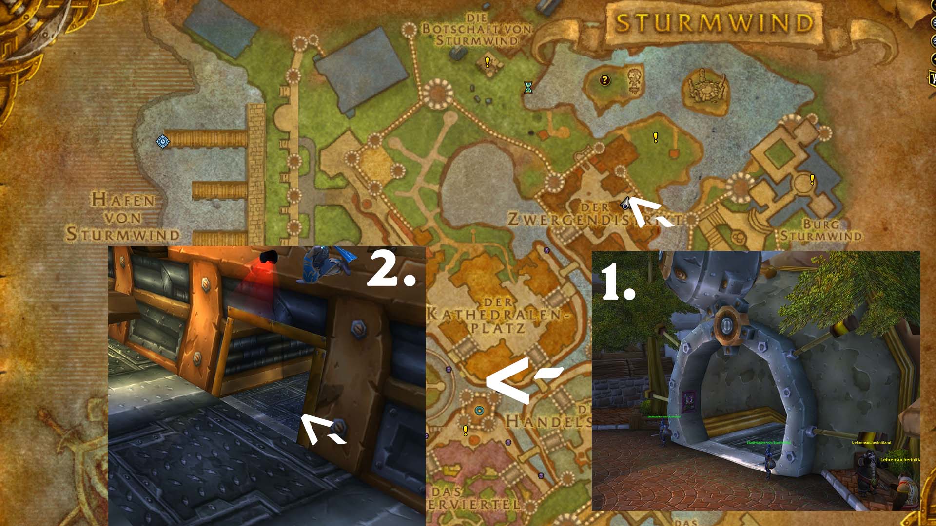 - Ort Allianz: Bizmos Boxbar unter der Tiefenbahn zwischen Sturmwind und Eisenschmiede – in Sturmwind in die Tiefenbahn, dann dort in den seitlichen Gang nach unten.
