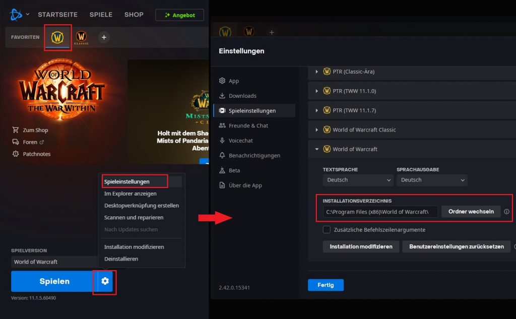 Als Erstes musst du zu dem Ordner gehen, in dem World of Warcraft installiert ist. Wenn du nicht weißt, wo dieser ist, kannst du im Battle.net-Launcher die Spieleinstellungen öffnen und auf der Registerkarte „World of Warcraft“ sehen, wo das Spiel installiert ist.