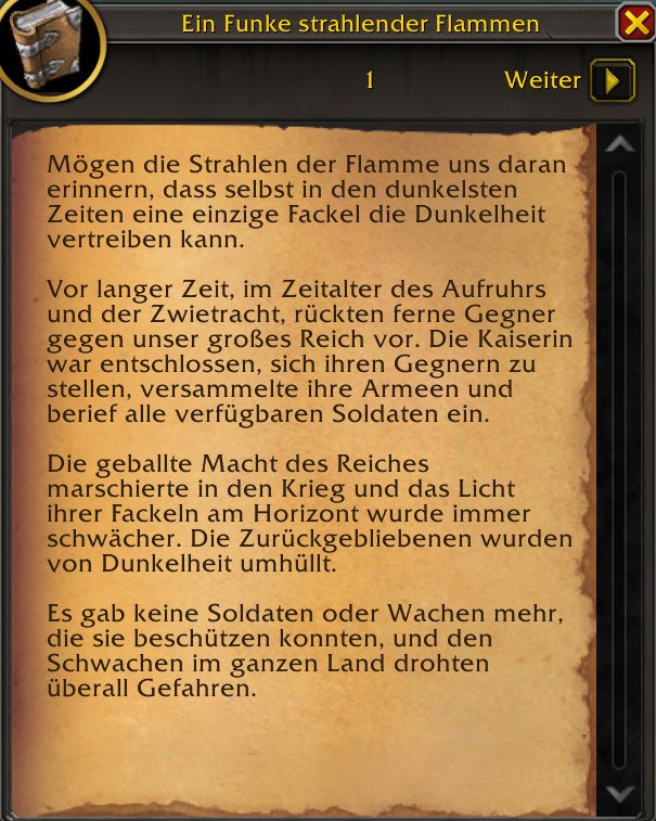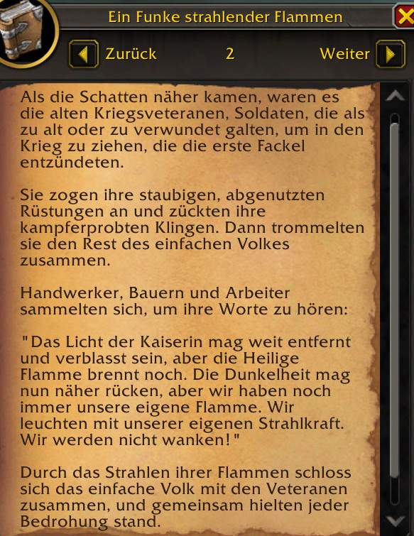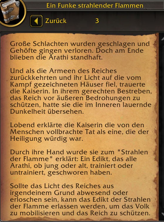 Die Erzählung weist auffällige Parallelen zur aktuellen Situation in Heilsturz auf. Ähnlich wie das Gebiet unter den Einfluss der Dunkelphase von Beledar geraten ist, scheint auch das alte Arathi-Imperium in eine Zeit der Finsternis eingetaucht zu sein. Bauern, Handwerker und Veteranen waren gezwungen, ihre eigene Version einer heiligen Flamme zu erschaffen, um den Schatten standzuhalten.