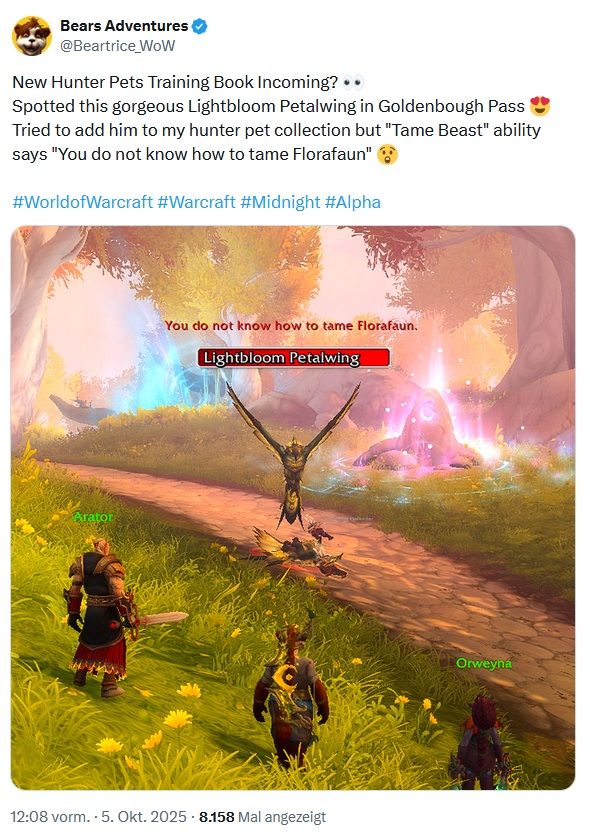 Warcraft Content Creator Bears Adventures hat diesen wunderschönen Lightbloom Petalwing im Goldenbough Pass entdeckt. Sie wollte ihn ihrer Jäger-Pet-Sammlung hinzufügen, aber die Fähigkeit „Tier zähmen” sagte: „Du weißt nicht, wie man Florafaun zähmt.”