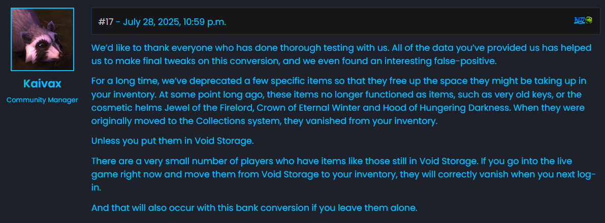 Es gibt eine sehr kleine Anzahl von Spielern, die solche Gegenstände noch im Leerenlager haben. Wenn ihr jetzt ins Live-Spiel geht und sie aus dem Leerenlager in euer Inventar verschiebt, verschwinden sie beim nächsten Einloggen korrekt. Das passiert auch bei dieser Bankkonvertierung, wenn ihr sie dort liegen lasst.