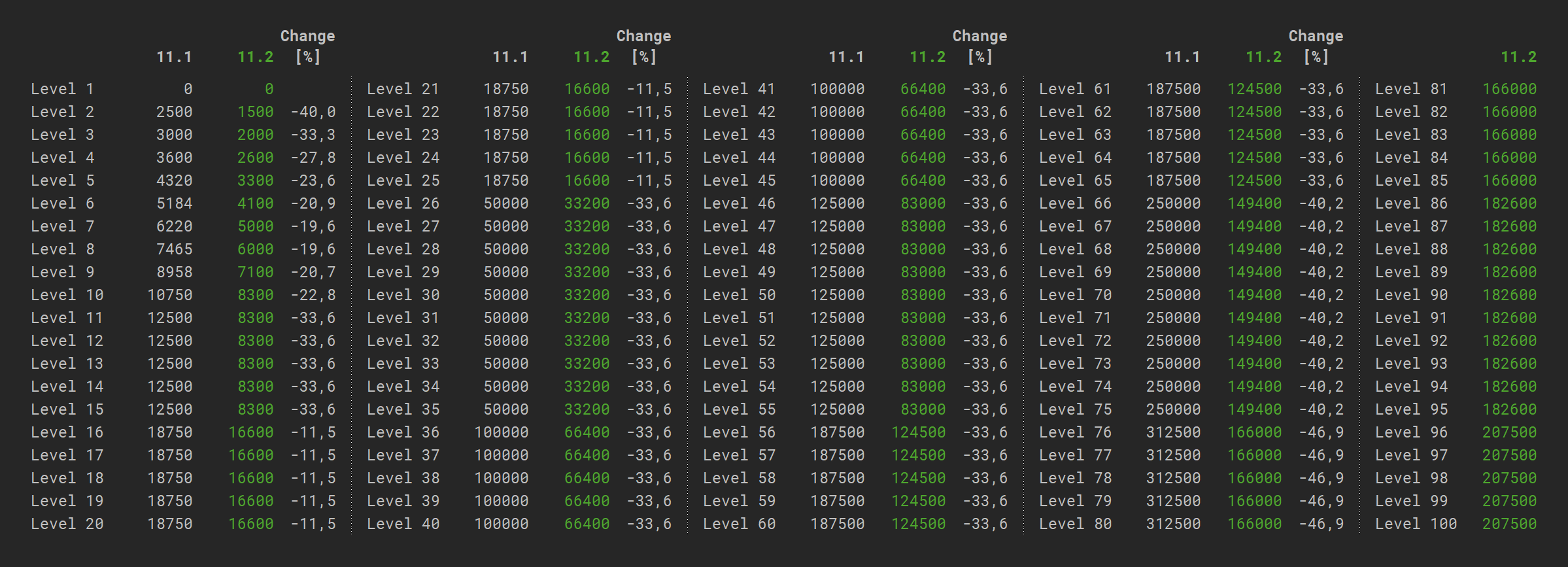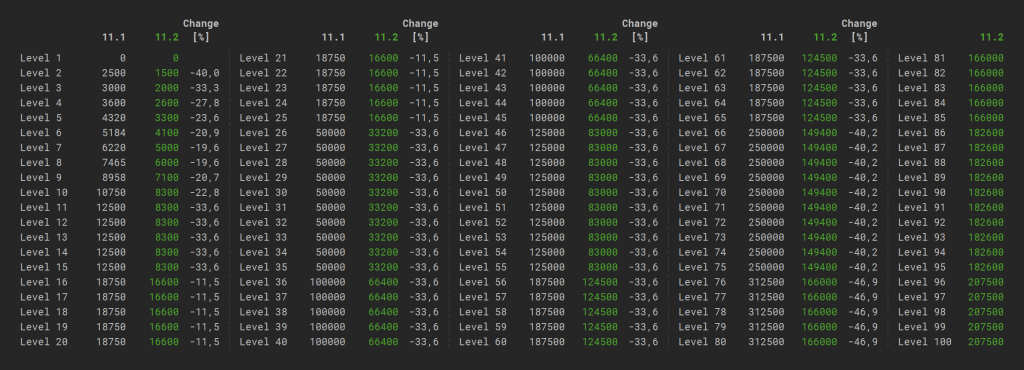 Wie ein Spieler feststellte, wird der Aufstieg auf Level 60 um etwa 37% beschleunigt. Derzeit sind insgesamt 312.500 Erfahrungspunkte erforderlich, ab Patch 11.2 wird diese Anzahl auf 166.000 Punkte reduziert. Für die nächsten 20 Stufen, die hinzugefügt werden, sind 41.500 Erfahrungspunkte nötig.