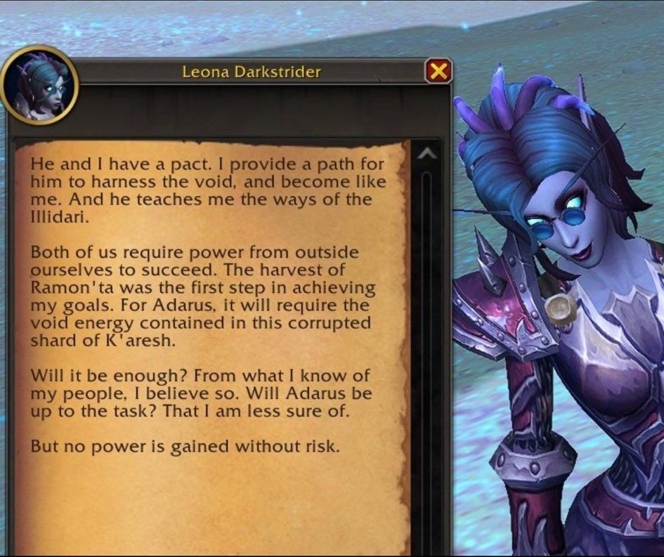 Der Screenshot rechts zeigt einen NPC aus dem Gebiet K’aresh. Leona Darkstrider hat anscheinend eine besondere Verbindung zu einem Dämonenjäger. Diese Leerenelfe möchte vom Dämonenjäger die Fähigkeiten der Illidari erlernen und bietet ihm im Gegenzug ihre eigenen Kräfte an.