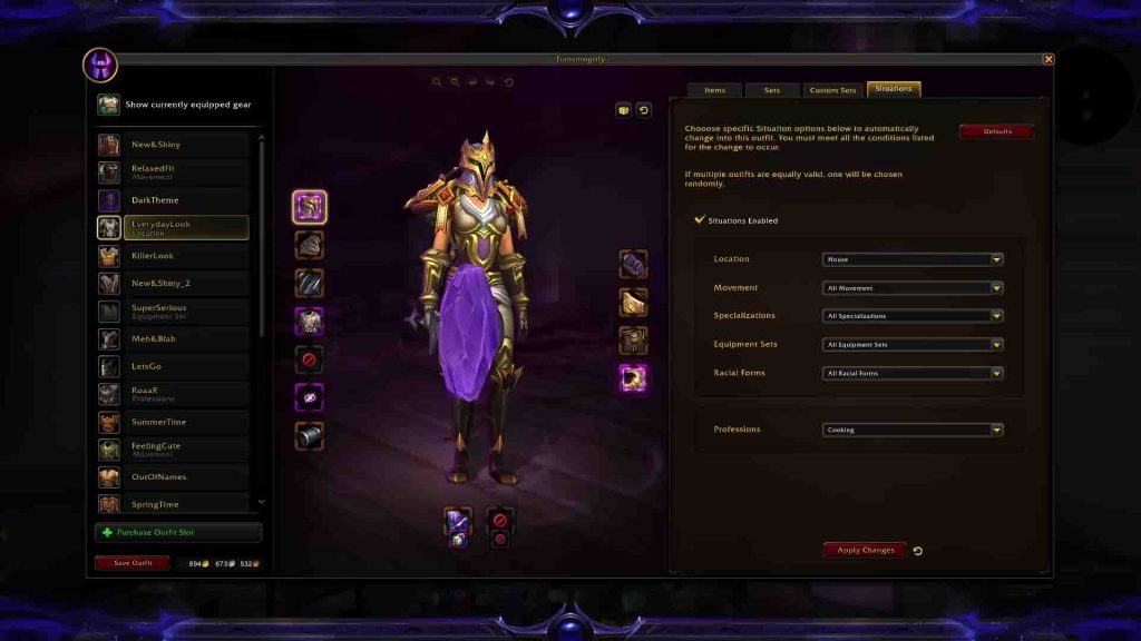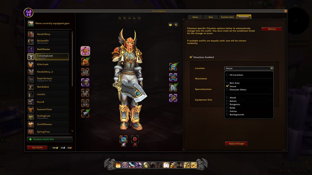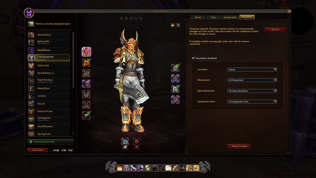 Mit Transmog 2.0 moggst du Ausrüstungsslots, nicht mehr einzelne Items. Neue Beute übernimmt automatisch den gespeicherten Slot‑Look. Du speicherst Dutzende Outfits, legst sie auf die Aktionsleiste und lässt sie per „Situationen“ – also Aktivitäts‑Triggern – automatisch wechseln.