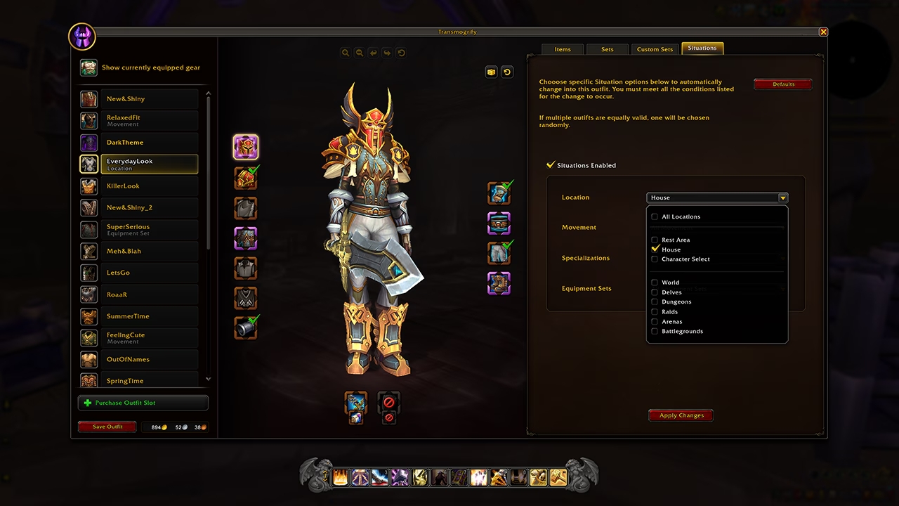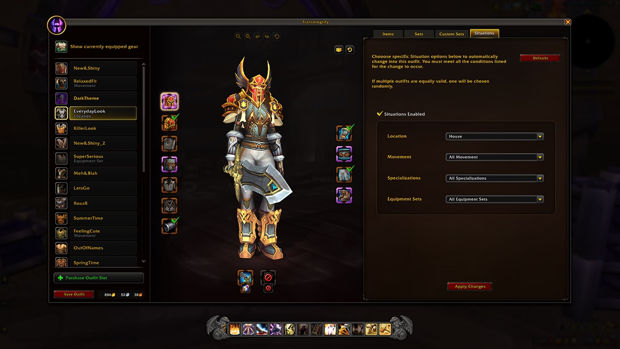 Mit Transmog 2.0 moggst du Ausrüstungsslots, nicht mehr einzelne Items. Neue Beute übernimmt automatisch den gespeicherten Slot‑Look. Du speicherst Dutzende Outfits, legst sie auf die Aktionsleiste und lässt sie per „Situationen“ – also Aktivitäts‑Triggern – automatisch wechseln.