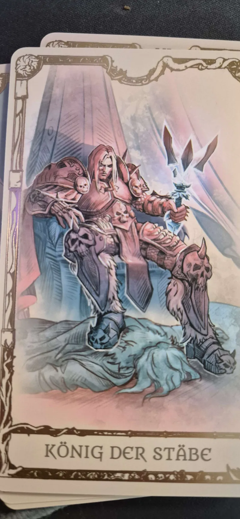 Der erste Eindruck des World of Warcraft Tarotkarten Sets ist schlichtweg beeindruckend. Die Karten selbst sind von hochwertiger Qualität – sie wirken nicht nur robust, sondern fühlen sich auch wertvoll an. Besonders hervorzuheben sind die feinen Verzierungen an den Rändern der Karten, die nicht nur ästhetisch ansprechend sind, sondern sich auch fühlbar abheben, was das Erlebnis beim Halten der Karten noch verstärkt.